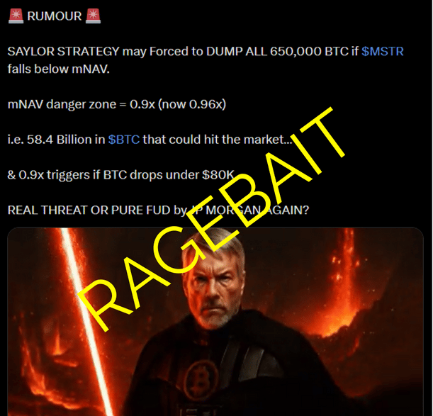 A Crypto account posted a Darth Vader meme of Michael Saylor with a red lightsaber. Headline: "RUMOUR - SAYLOR STRATEGY may be Forced to DUMP 650,000 BTC if $MSTR falls below mNAV."