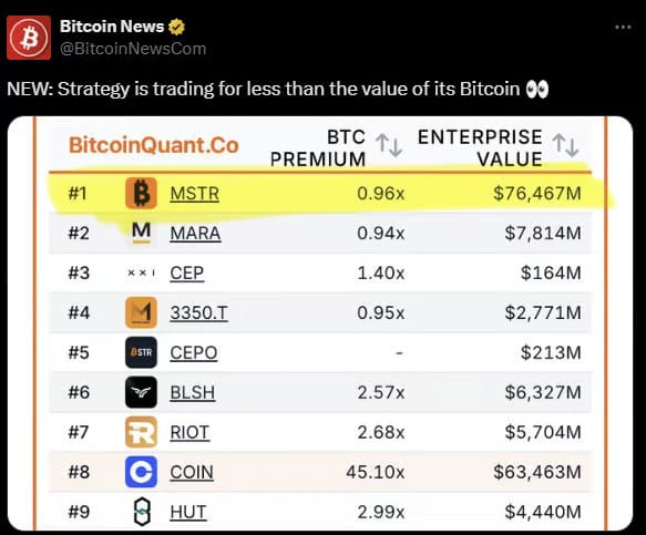 In reality, their stock prices are down and theyโre now trading at discounts to the value of their underlying Bitcoin holdings: