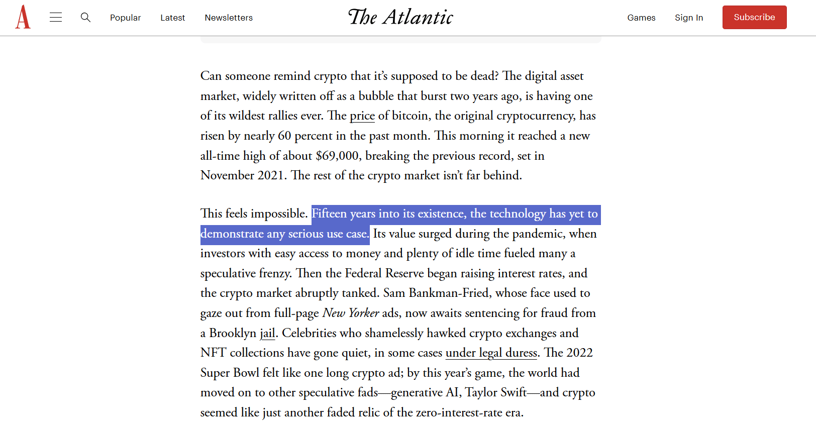Back in 2024, The Atlantic published the below article, claiming that "Bitcoin “has yet to demonstrate any serious use case”.
